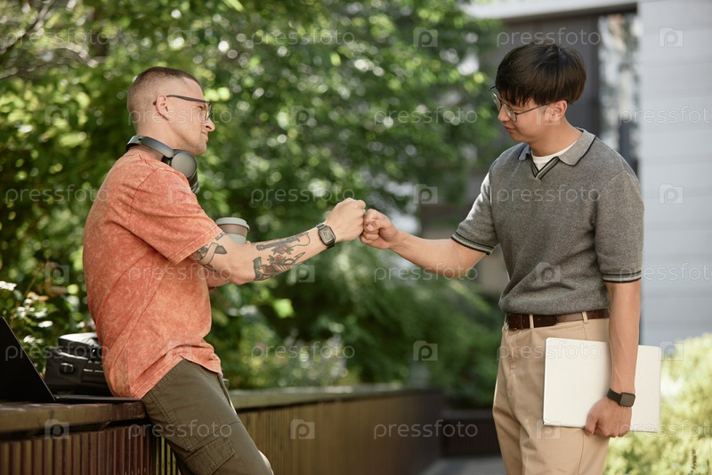 Программист бьется кулаками с партнером во время встречи в IT-парке