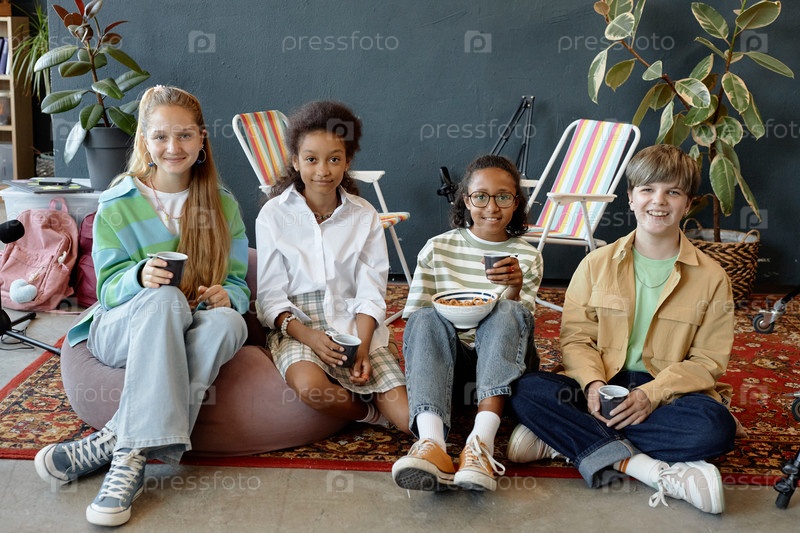 Группа детей, сидящих на мешках с бобами