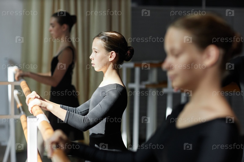 Решительная молодая девушка, стоящая на скамейке обучения балетным позициям в танцевальной студии