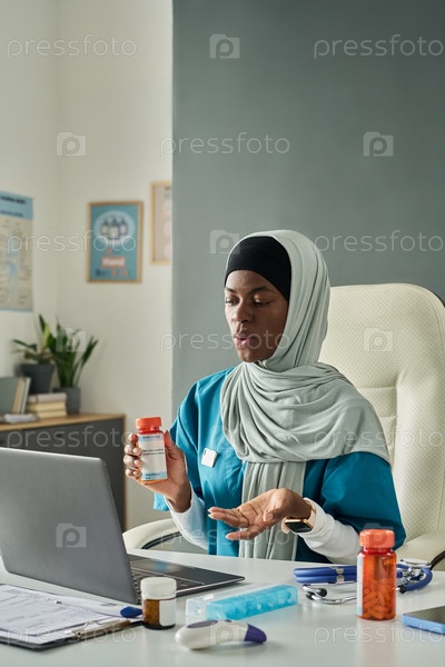 Мусульманка сидит в офисе и держит таблетки