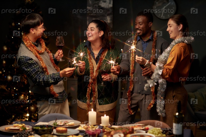 Веселые люди, держащие бенгальские огни во время празднования Рождества дома