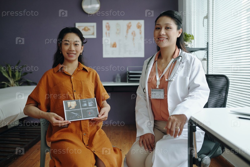 Улыбающаяся беременная женщина с доктором, держащим ультразвук