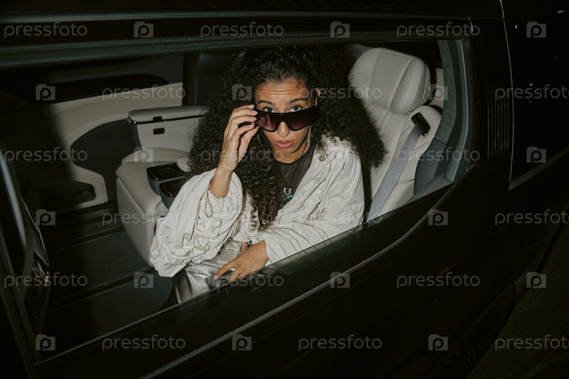 Известная женщина с кривыми солнцезащитными очками удивлена папарацци, сидящей на заднем сиденье машины