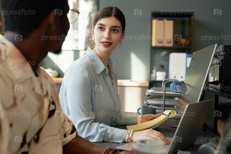 Девушка, разговаривающая с коллегой в офисе