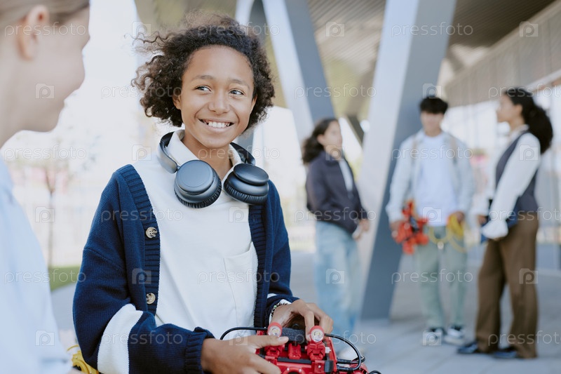 Улыбающийся смешанная раса подросток на скамейке