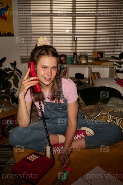 Улыбающаяся девушка сидит, держа красный телефон