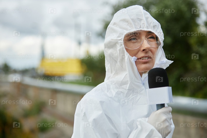 Женщина в опасном костюме держит микрофон