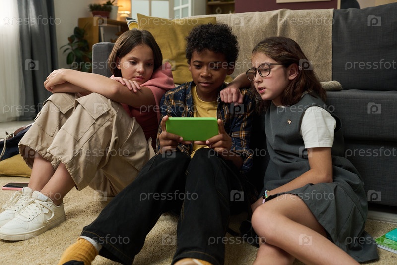 Дети смотрят что-то вместе на мобильном устройстве