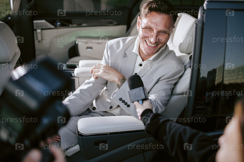 Улыбающаяся мужская знаменитость дает интервью, разговаривает с телевизионными журналистами в машине
