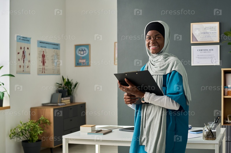 Улыбающаяся мусульманка держит доску в медицинском кабинете