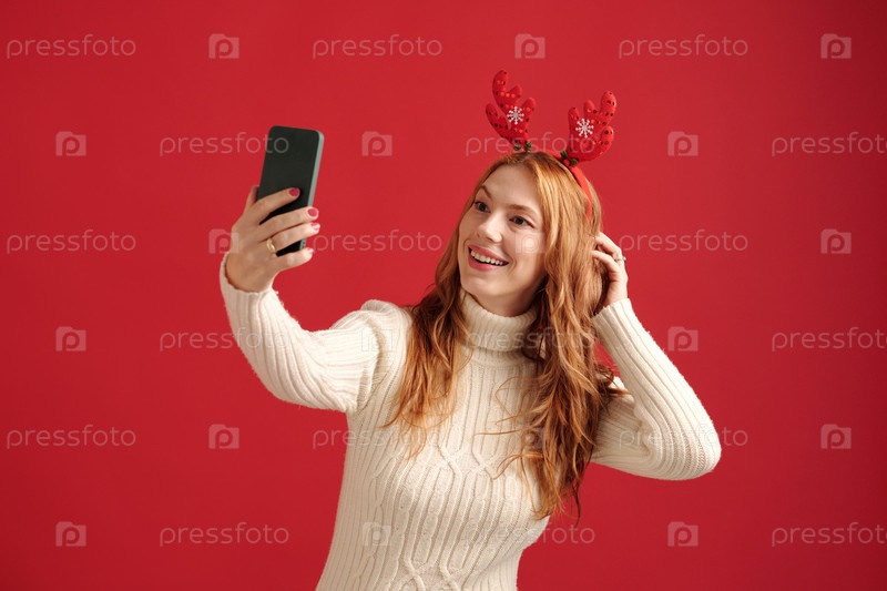 Улыбающаяся женщина делает селфи в праздничной головной ленте оленей