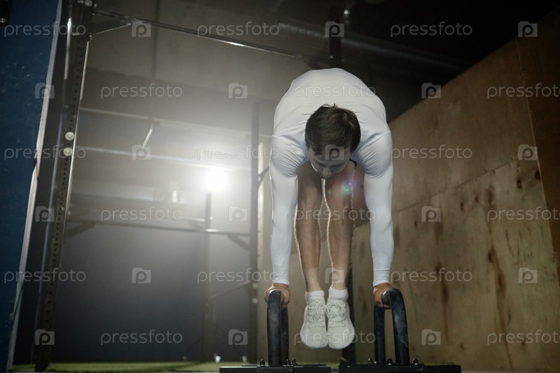 Сильный мужчина балансирует в ручном положении на параллельных барах против подсветки в тренажерном зале
