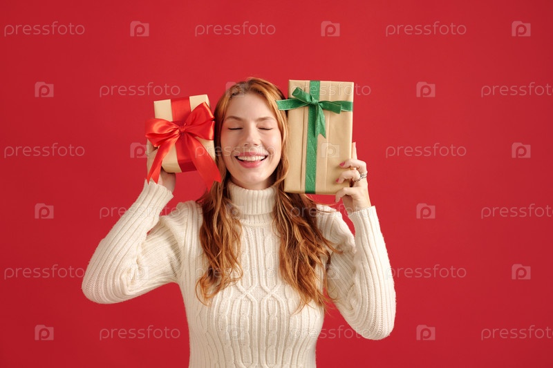 Улыбающаяся женщина держит коробки с подарками на красном фоне