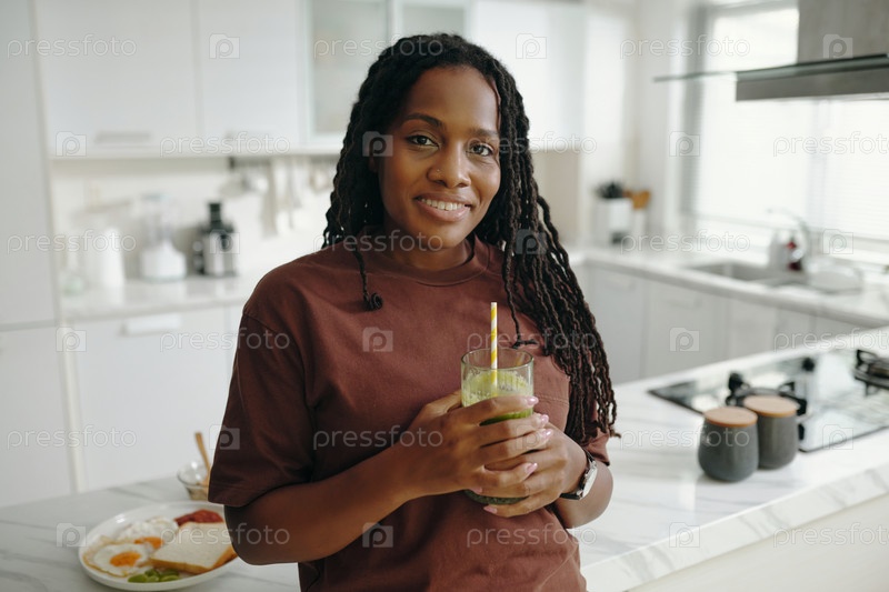 Портрет улыбающейся женщины, держащей стакан в современной кухне