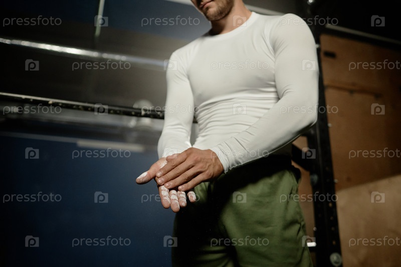 Мускулистые мужчины зажигают руки, готовясь к тренировке на высоком баре в спортзале