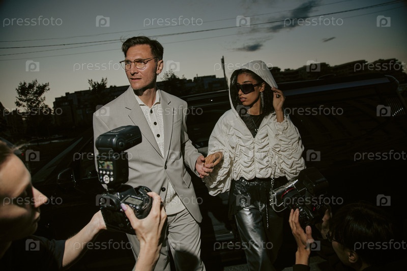 Мужская знаменитость, схваченная папарацци, держится за руки со своей девушкой в ночное время на свежем воздухе