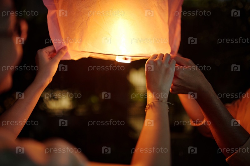 Романтическая пара запускает китайский фонарь