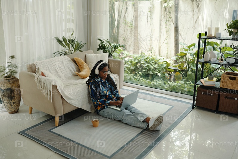 Молодая женщина расслабляется, слушая на ноутбуке