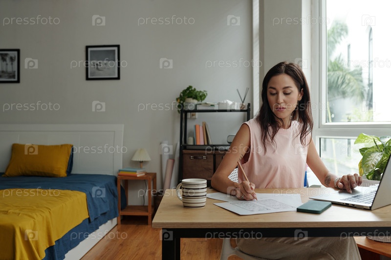 Женщина, работающая дома с ноутбуком и документами