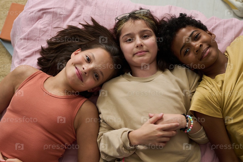 Улыбающиеся дети, лежащие вместе на кровати и веселящиеся