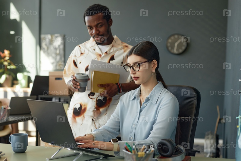 Деловая женщина, которая носит очки и использует компьютер в офисе