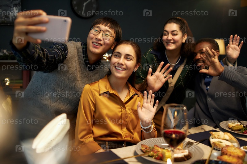 Улыбающиеся люди, машущие руками и делающие селфи во время празднования Рождества дома