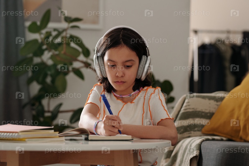 Сосредоточенная девушка, носящая наушники, учится в гостиной
