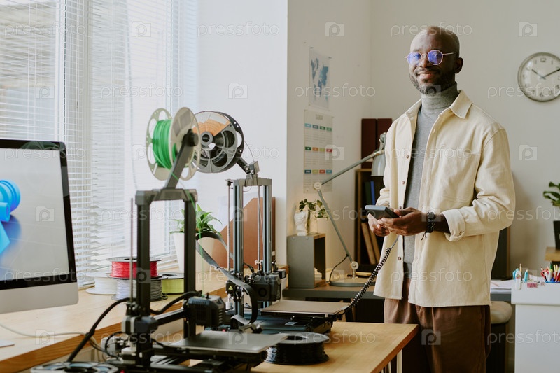 Портрет улыбающегося мужчины, регулирующего настройку 3D-печати
