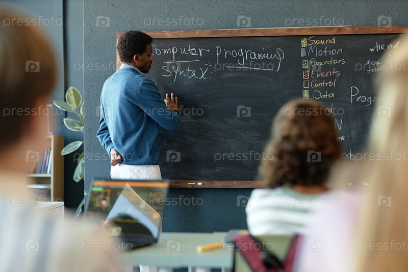 Вид чернокожего учителя-мужчины, пишущего на доске в заднем классе