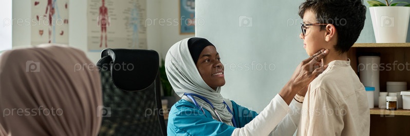 Дружелюбный мусульманский врач осматривает молодого мальчика в медицинском кабинете