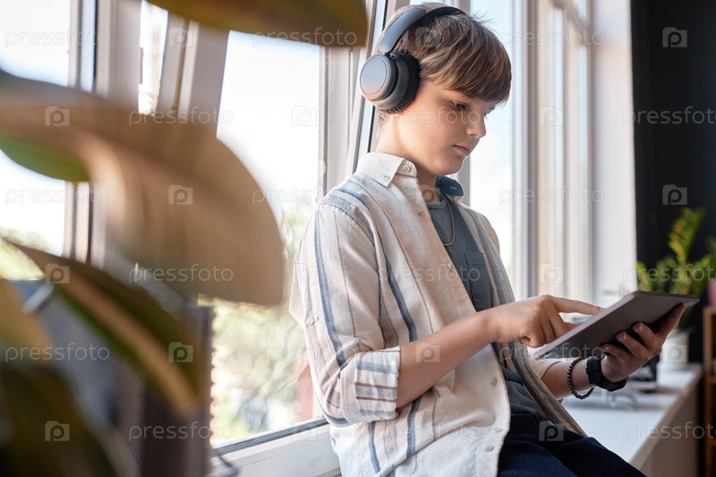 Мальчик-подросток, носящий наушники с использованием цифрового планшета у окна в школе