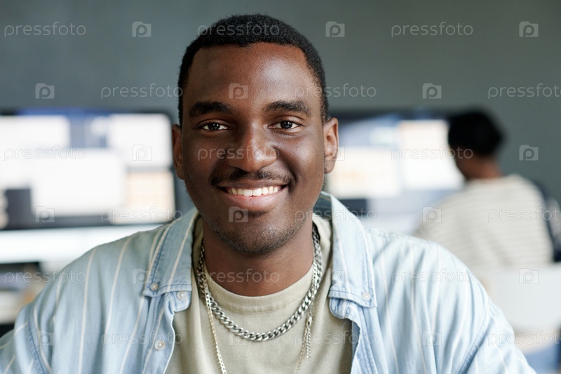 Портрет улыбающегося мужчины в непринужденной одежде в офисной обстановке