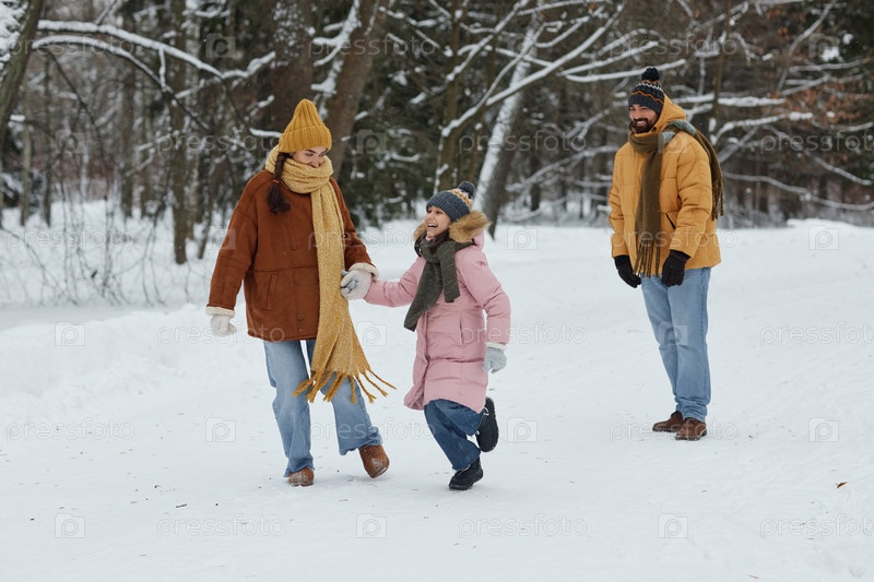 Семья наслаждается прогулкой по зимнему лесу