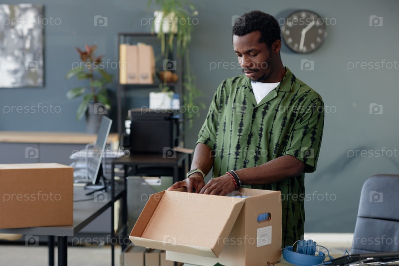 Черный человек распаковывает коробки на столе в пустом офисе
