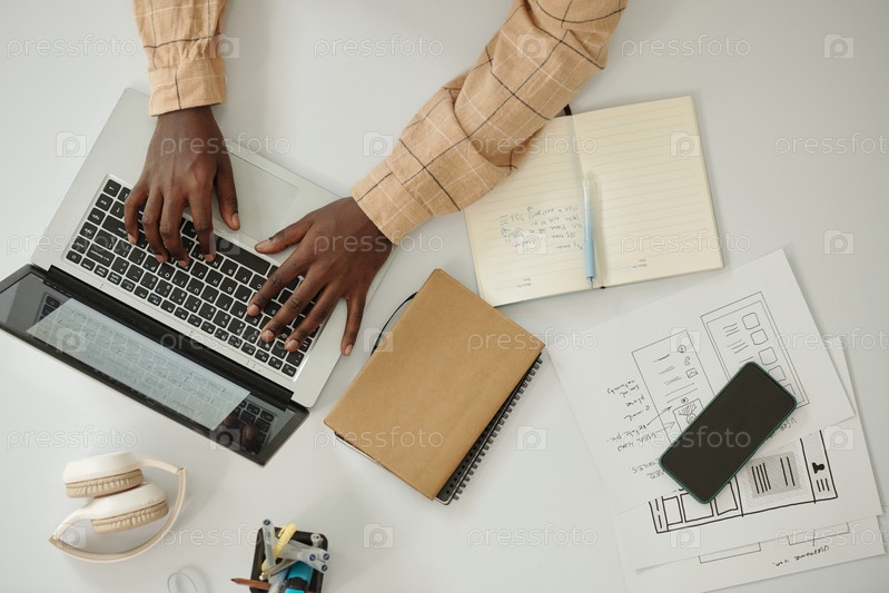 Человек, печатающий на ноутбуке с планировщиком поблизости