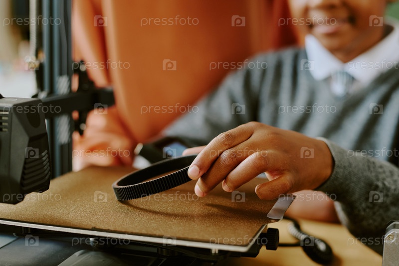 Человек, эксплуатирующий 3D-принтер с акцентом на детали