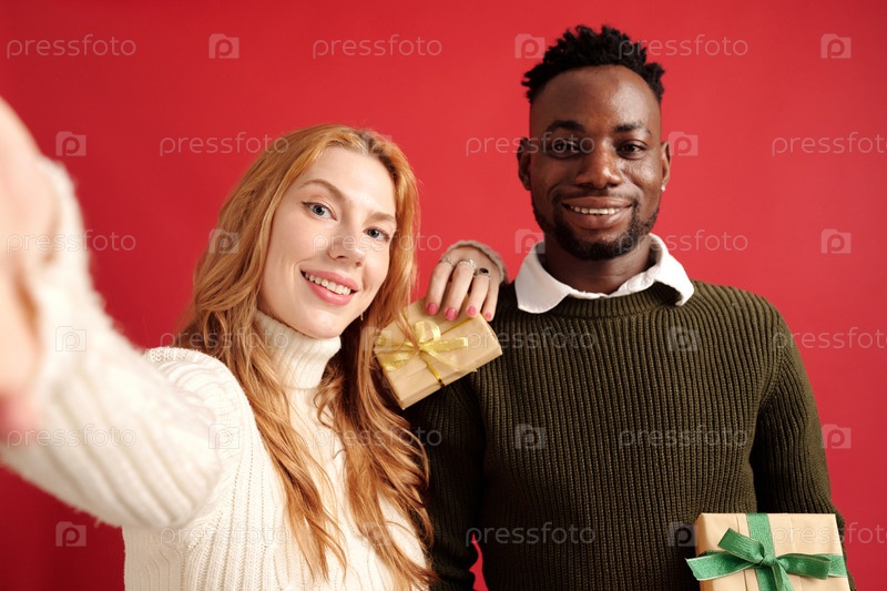 Улыбающаяся пара держит коробки для подарков на красном фоне