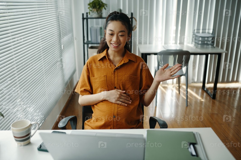 Улыбающаяся беременная женщина участвует в онлайн-встрече