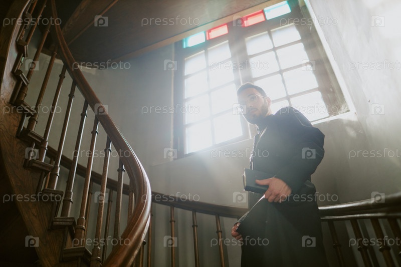 Священник в черном халате держит Библию