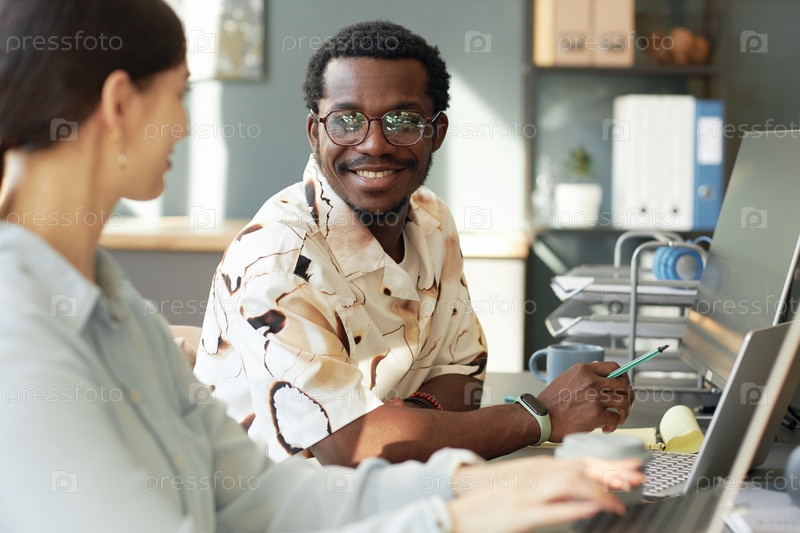 Улыбающийся чернокожий мужчина разговаривает с коллегой