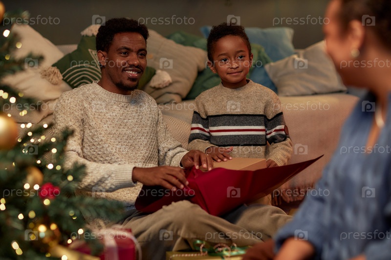 Отец и сын открывают подарки на Рождество