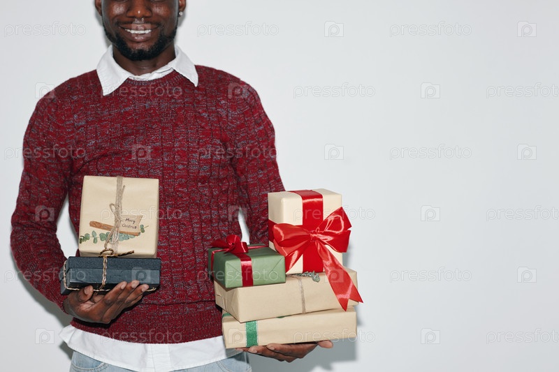 Улыбающийся мужчина держит праздничные коробки для подарков с радостью
