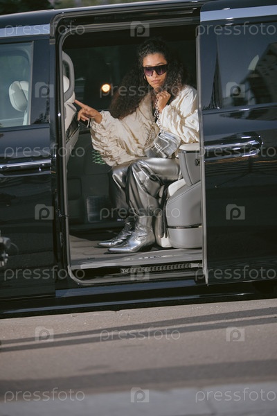 Знаменитость в металлургическом наряде выходит из лимузина на городской улице