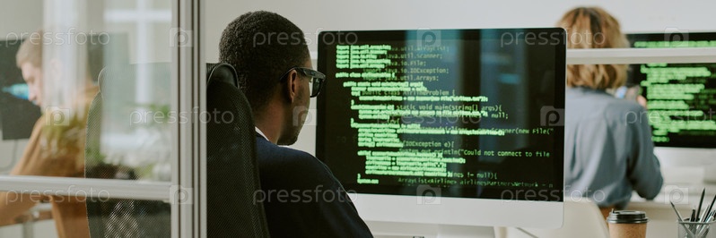 Непризнанный чернокожий человек кодирует на баннере веб-сайта компьютера