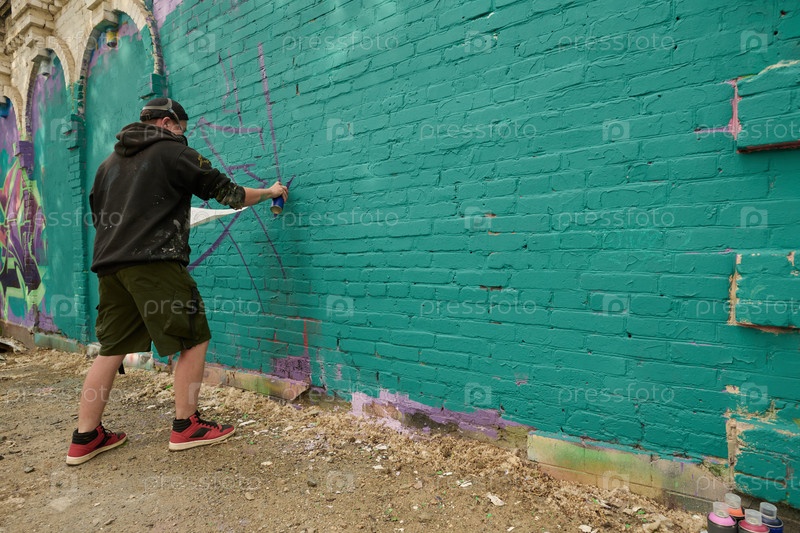 Человек создает новое произведение искусства на зеленой стене