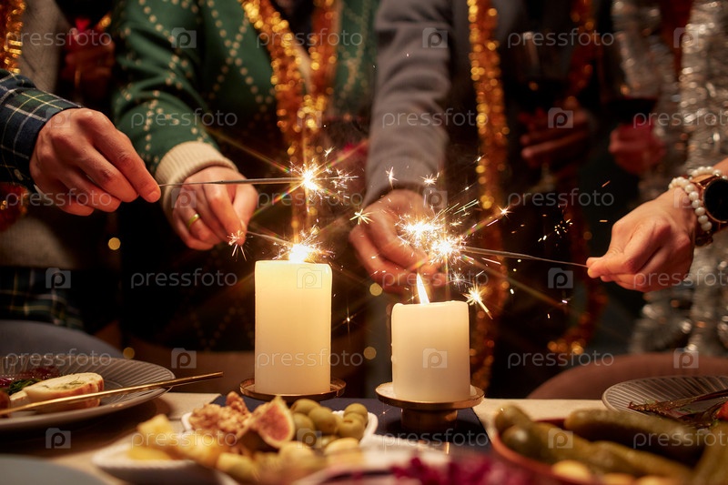 Руки разнообразной группы людей зажигают искры от свечей, празднуя Рождество