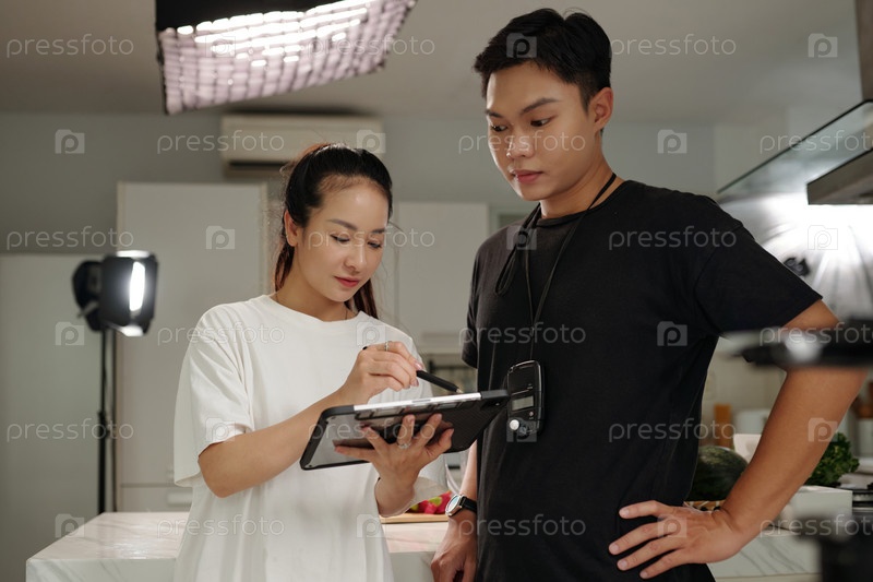 Оператор проверяет контент на планшетном ПК