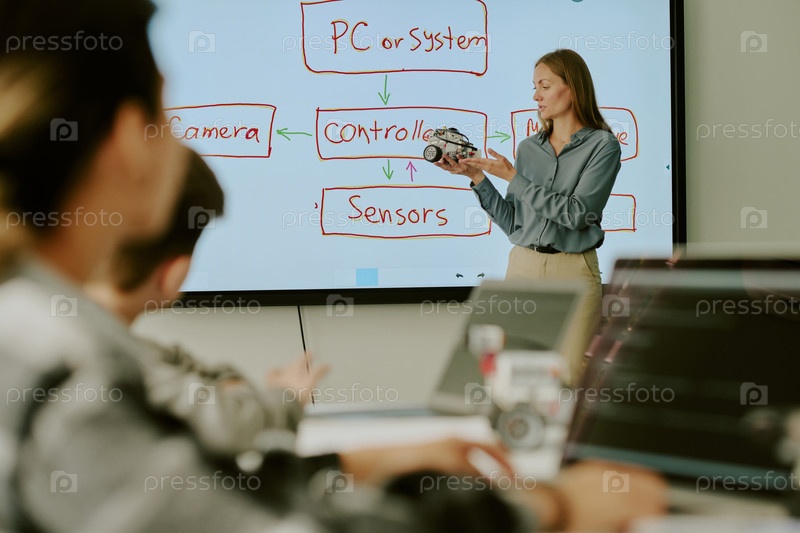 Непризнанные ученики смотрят на робота в руках учителя