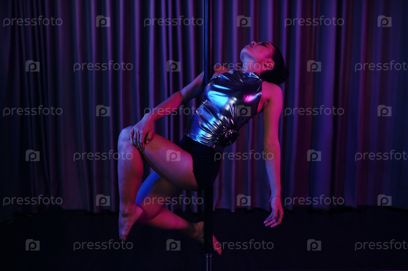Женщина, исполняющая танец на столбе в блестящем костюме