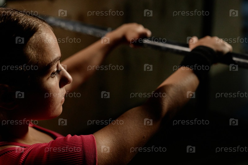 Профиль женской гимнастки с руками на баре, думающей о сложных состязаниях в темном тренажерном зале